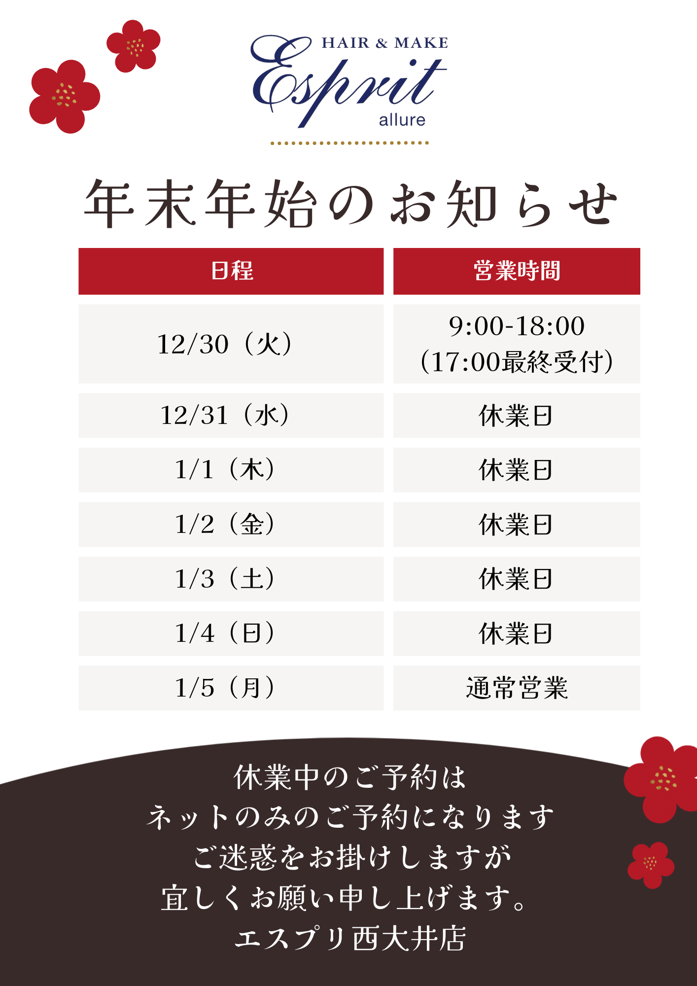 年末年始営業日のお知らせ